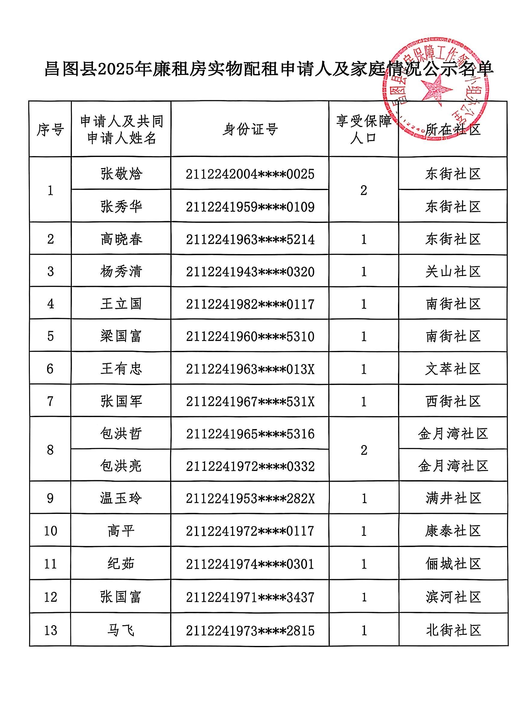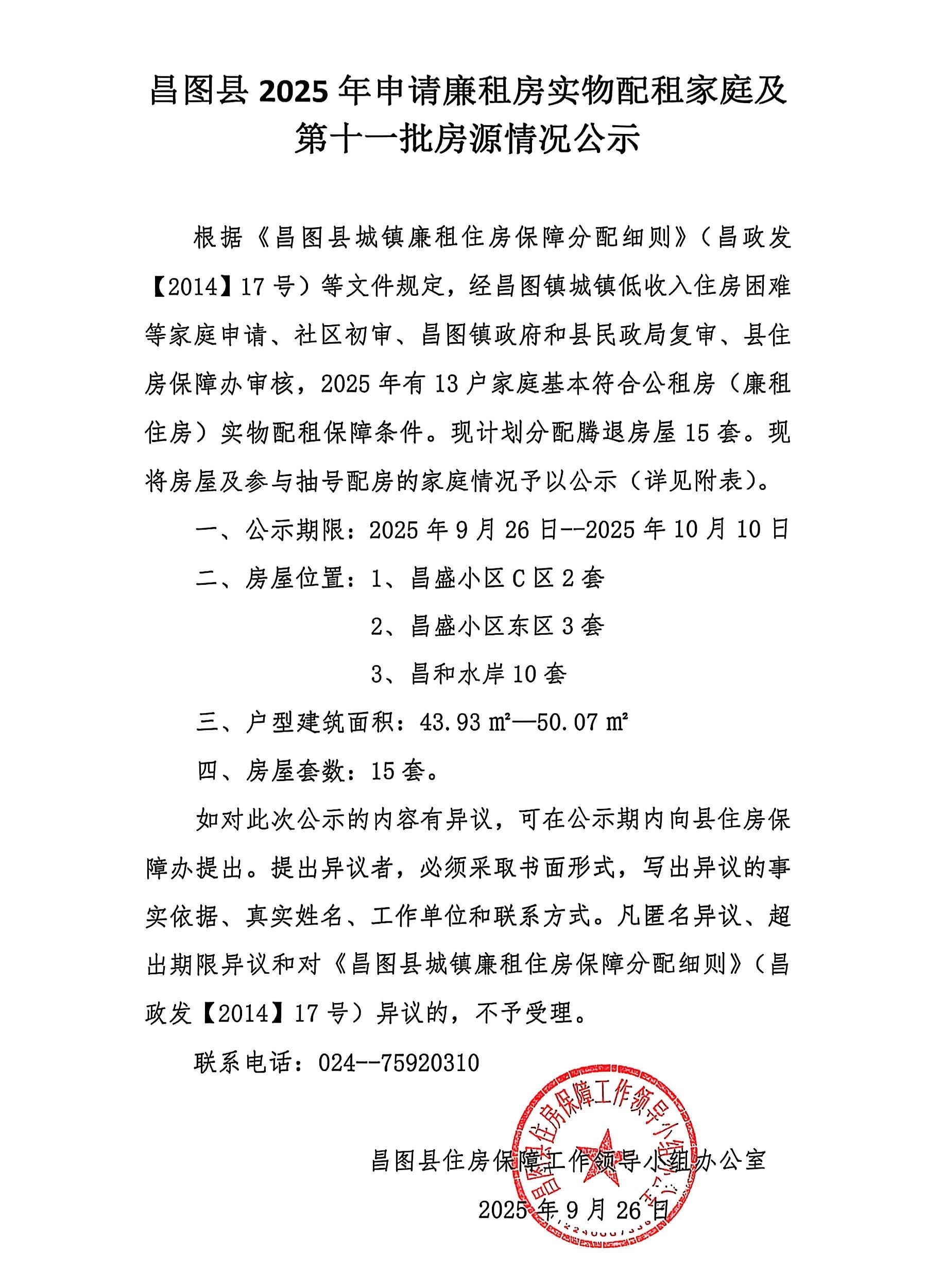 昌图县2025年申请廉租房实物配租家庭及第十一批房源情况公示