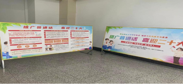 各级各类学校还利用学校电子屏幕、LED显示屏滚动推出第25届推普周主题以及宣传标语,“推广普通话,喜迎二十大”。